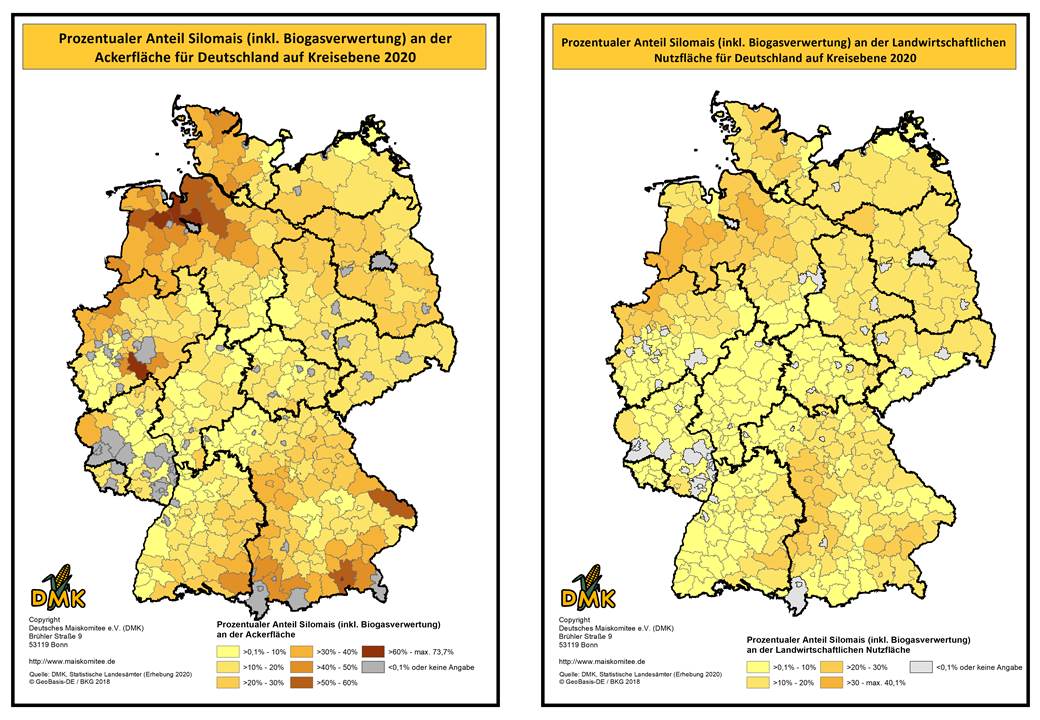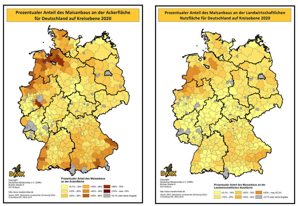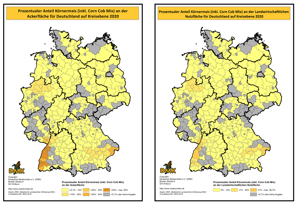 Auf dieser Seite haben wir die statistischen Daten zum Maisanbau, auf Kreisebene, in Karten projiziert. Die Daten basieren auf der Landwirtschaftszählung, die 2020 durch die Statistischen Ämter des Bundes und der Länder durchgeführt wurde. Die nächste Landwirtschaftszählung wird voraussichtlich 2030 erfolgen.